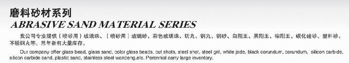 我品牌可以提供(噴(pen)砂(sha)(sha)用)有機(ji)玻(bo)璃(li)窗(chuang)鋼(gang)珠、(噴(pen)砂(sha)(sha)用)有機(ji)玻(bo)璃(li)窗(chuang)鋼(gang)砂(sha)(sha)、多彩有機(ji)玻(bo)璃(li)窗(chuang)鋼(gang)珠、切丸、鋼(gang)丸、鋼(gang)砂(sha)(sha)、白剛(gang)玉(yu)、黑(hei)剛(gang)玉(yu)、棕剛(gang)玉(yu)、增碳(tan)硅砂(sha)(sha)、pp塑料砂(sha)(sha)、不銹鋼(gang)圓管(guan)丸等。一年到(dao)頭常備大批量交易(yi)量。