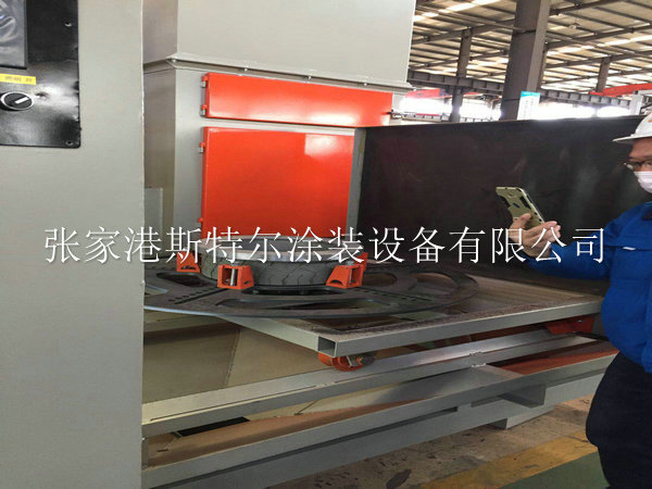 該設備由砂料回收系統、噴砂系統、除塵系統、工件旋轉及控制系統等組成。本設備的工件旋轉部分采用轉盤旋轉,輪轂在轉盤上旋轉的同時輪轂上方還布置8把擺動普壓噴槍,機倉內設有除塵及回砂系統,當工件通過噴砂后,可將工件清理干凈,從機倉出來前將用壓縮空氣將工件表面的粉塵吹凈,并吸到除塵箱里。我公司在設計輪胎模具噴砂機的相對經驗還是比較豐富,在噴砂機的設計理念上使用了新的技術和方案,保證在使用加工時候達到低能耗,低故障,高環保等要素,實現傻瓜式操作噴砂機加工模具。在工件進入工作倉的同時,可以實現手工操作和自動化操作,在噴砂機磨料撞擊工件產生的粉塵無任何泄露,保證操作工人的身心健康,噴砂機在使用中工作倉會產生粉塵等雜物我們通過旋風分離設備直接過濾和清除掉,防止二次污染等。整體噴砂設備機械配備了智能化控制系統,預警報警燈功能,在工件進入工作倉實現預警,在噴砂加工結束實現報警取件等措施,在使用中發揮設備的較大效率。